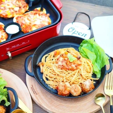 同じくセリアのスキレット風プレートを使って、ミートボールパスタを演出。