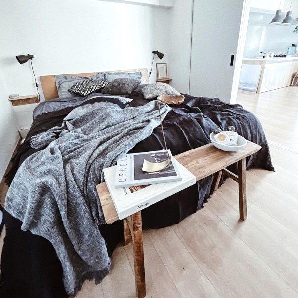 ベッドのサイドにベンチを置かれていますが、ベンチの上にはファーのラグやニット素材のクッションなどを置いて秋冬らしい雰囲気を演出されています。