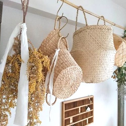 キッチンではなくリビングに竹かごを吊るすことでとてもおしゃれな雰囲気が出せます。