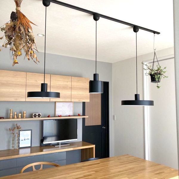 ペンダントライトをはじめ、ダイニングチェアやライティングレール、リビングドアなど黒色を取り入れることで空間が引き締まりますね。