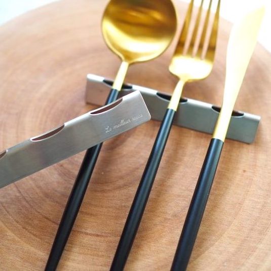 ステンレス素材で日本製の「カトラリーレストロゴ」は、プチプラに見えない高見えアイテム。