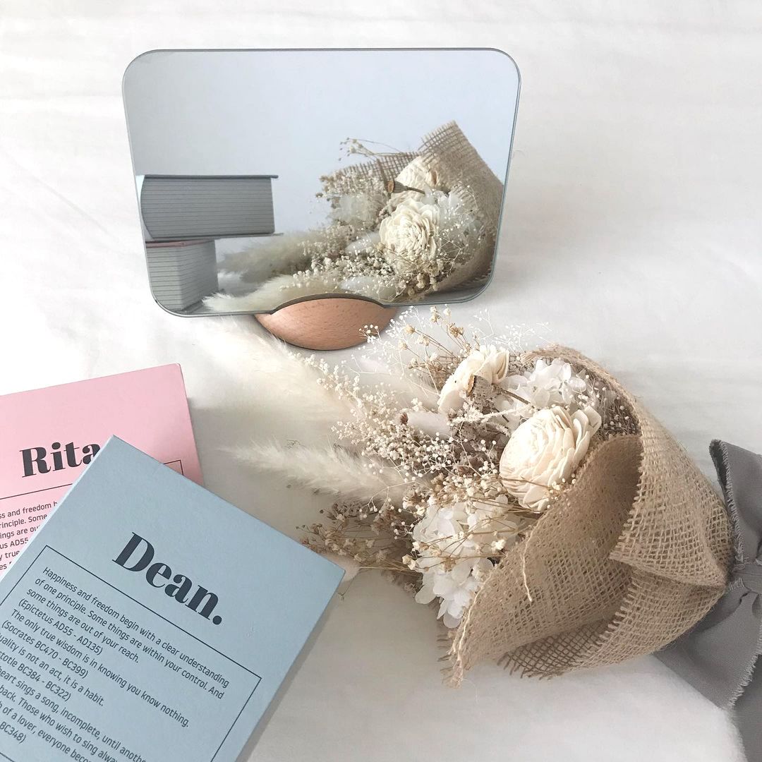 木製のスタンドにミラーを挟んで立たせるタイプで、縦横どちらでも使えますよ。ホワイトマーカーでアレンジしても素敵ですよね。