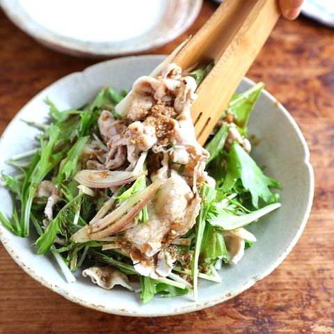 水菜としゃぶしゃぶにした豚肉を合わせて、ポン酢やすりごまで作るタレとみょうがや大葉などの香味野菜を添えていただきます。