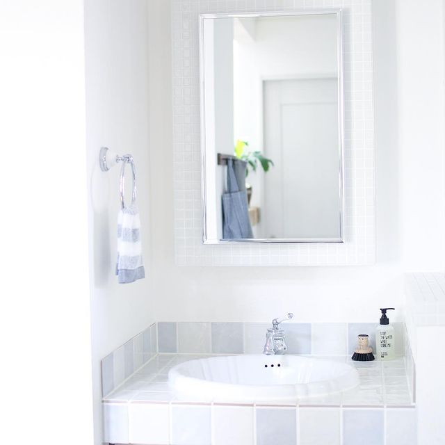 洗面台周りのアイテムをホワイトで統一した、明るく清潔感のある洗面所インテリア。