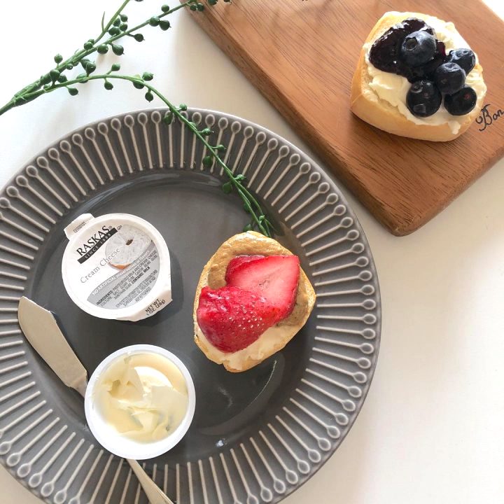 半分にカットしたディナーロールにクリームチーズといちご、ブルーベリーをそれぞれのせて朝食やおやつにもなるレシピに。