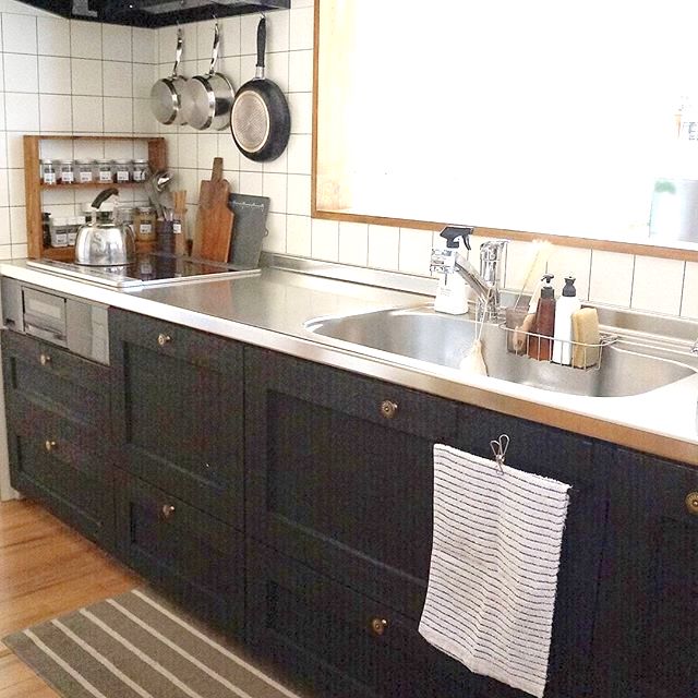 タオルやふきんと一緒に生活感の溢れるゴム手袋をシンク下にまとめて干すと、おしゃれなダイニングやリビングからの視界に入らないので安心です。