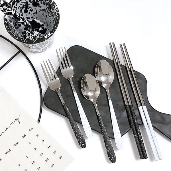 お箸とデザートスプーン、そしてデザートフォークを色違いで揃えてテーブルをスタイリッシュに演出してくれそう。
