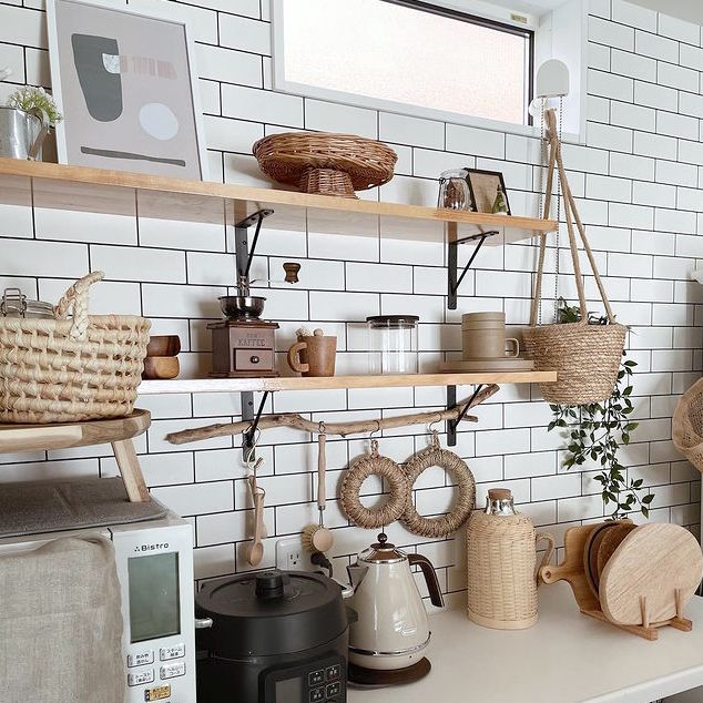 上の棚はインテリア小物、下の棚は実用的な使い方をするアイデアも素敵です。キッチン背面はアイデア次第で、いろいろな使い方ができます。