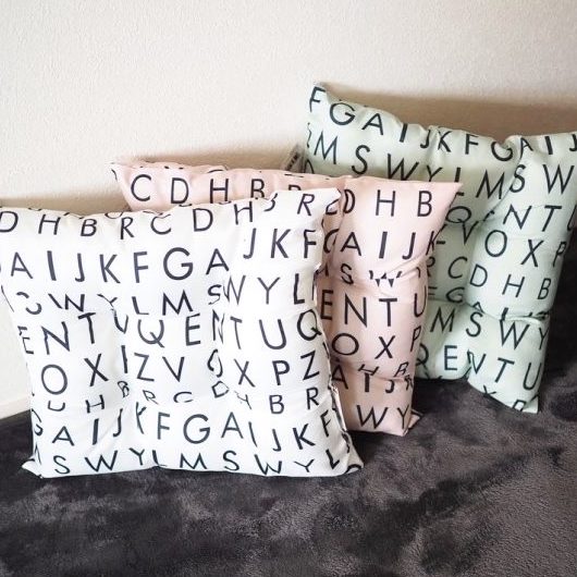 まず最初にご紹介するのは、アルファベット柄がおしゃれな「角型クッション 文字柄」です。
