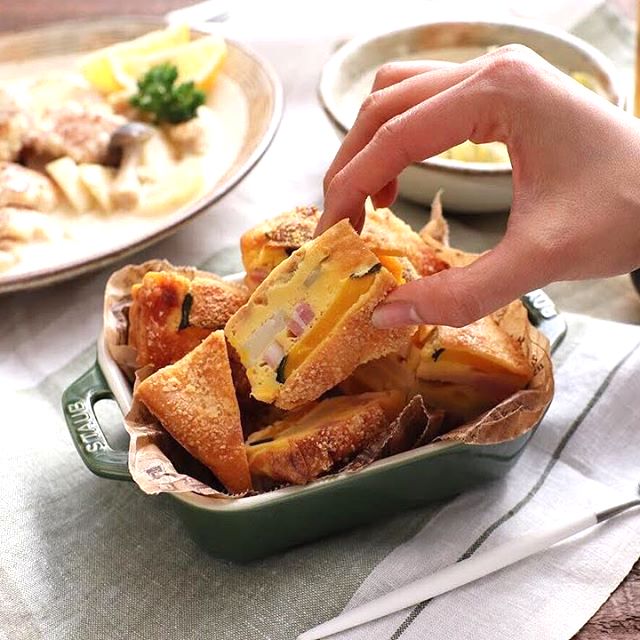 ズッキーニとトマトのオープンキッシュは1つずつ器に入れて焼くので、取り分ける手間が省けて良いですね。