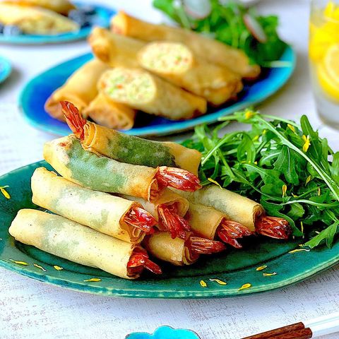 春巻きを広げてエビや大葉を巻いて揚げただけの簡単なレシピです。