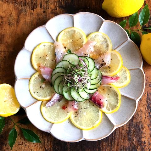 真鯛、レモン、きゅうり、香味野菜といった少量の材料なのに、盛り付けでこんなに豪華になります!