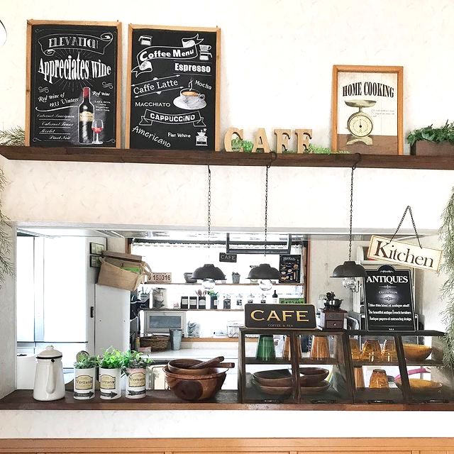 カフェらしい看板やショーケースを置いて、キッチンを「おうちカフェ」にしている実例です。