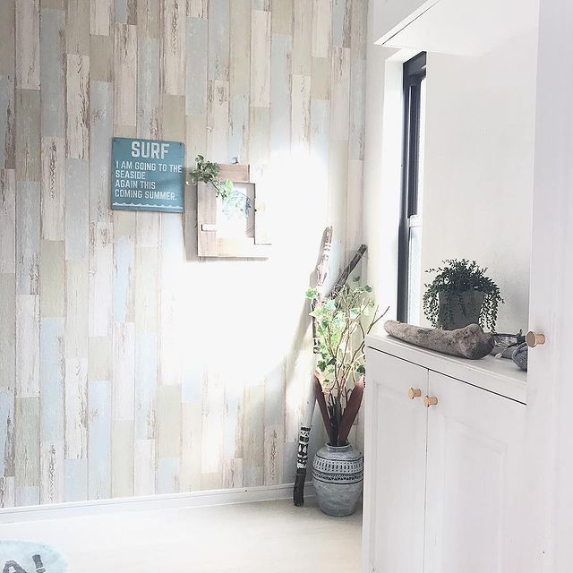 ビーチハウスのような空間のデザインとなっており、ナチュラルな雰囲気を漂わせています。住まいの玄関にはこのようなデザイン性のある壁にするのもおすすめ。