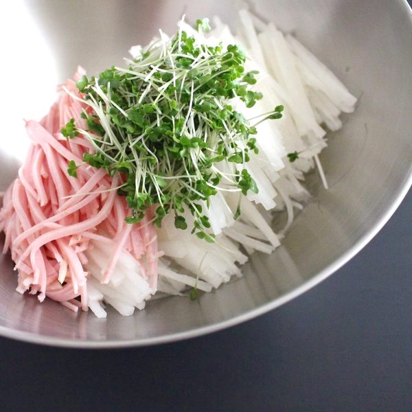 お気に入りの食器に千切りにした大根を入れ、上にハムとかいわれ大根を盛り付ければ、シンプルな材料でレシピも簡単ですが見た目のおしゃれな一品に。