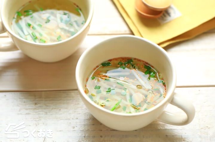 10分ほどでできる人気のさっぱりスープはいかがでしょうか。耐熱容器に食材を入れてレンジで加熱するだけで作れますよ。