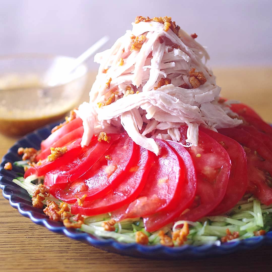 中華料理のバンバンジーといえば、きゅうりやトマトで鶏肉と一緒に食べるレシピですよね。あっさりした材料を使っていて、夏場にもおすすめの一品です。