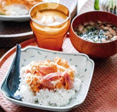 こちらは鮭フレークといくらで作る簡単丼。鮭フレークは塩鮭をほぐしてストックした手作りを使えば、手抜き感なく豪華な夕飯に。