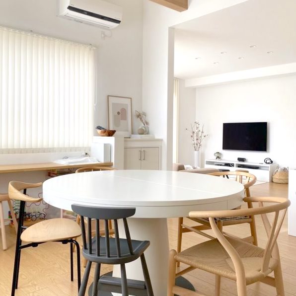 ホワイトのラウンドテーブルは真ん中に割れ目があり、伸長式にできるようです。