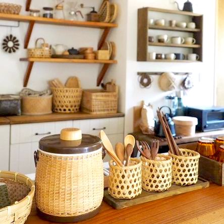 天然素材のアイテムはおしゃれで温かみがあるので、引き出しがないキッチンでの使用もお勧めです。この収納方法なら生活感も出ませんね。