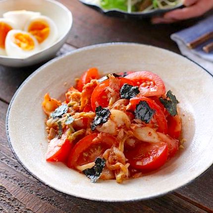 こちらはキムチにトマトやツナを合わせたレシピで、旨味たっぷりの食材との組み合わせでお酒とも相性抜群のおすすめメニューです。