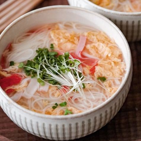 ふわふわの卵が温麺と絡んで絶品です。トッピングに安くて見栄えの良いカニカマを使うと節約にもなります。