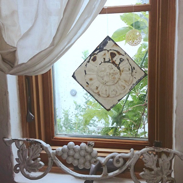 おしゃれなヴィンテージ風のリビング窓コーディネート事例をご紹介します。こちらでは、おしゃれなデザインのタイルを吊るしています。