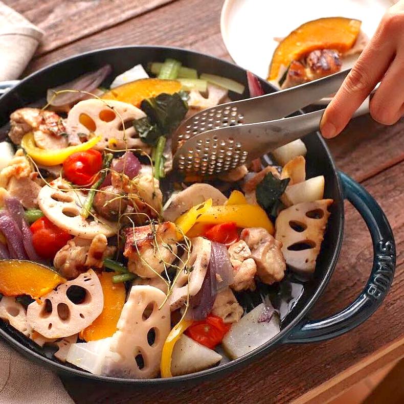 見た目はおしゃれですが、作り方は簡単ですよ。塩麹漬けした鶏肉を焼き、野菜を入れてそのまま蒸し焼きにするだけです。