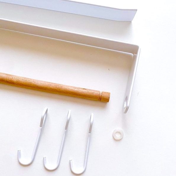 ネジやクギは不要で、キッチン棚にはさんで使用できる便利な3連フックが出ています。
