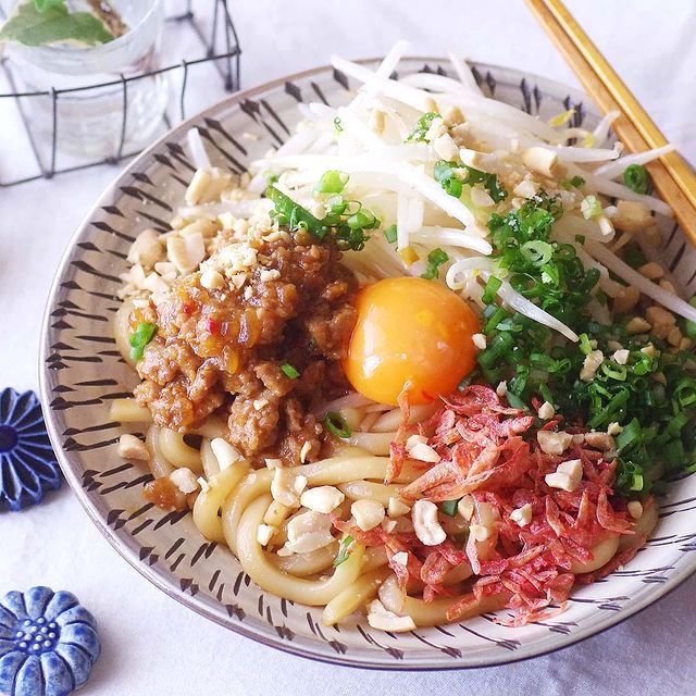 甘辛く味付けした肉みそやもやし、サクラエビ、ねぎ、卵黄など具材がたくさん入ったこちらの甘辛うどんも美味しそうですね。