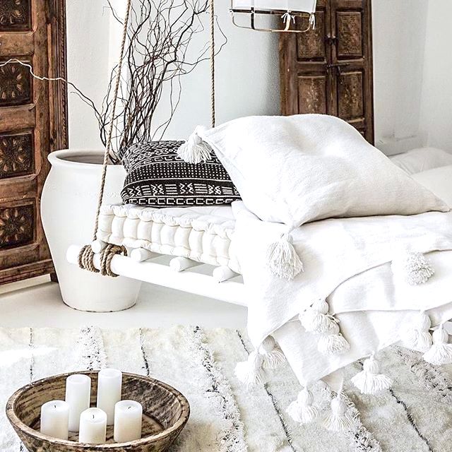 ホワイトをベースにした、モロッコテイストのオリエンタルインテリア実例となります。ポンポンが付いたブランケットとクッションカバーが可愛いですよね。