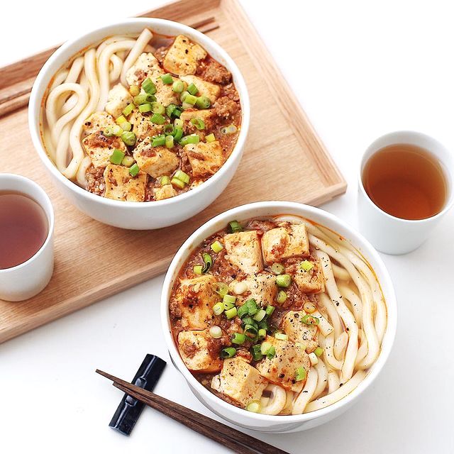 豚ひき肉と豆腐を使った料理といえば麻婆豆腐が定番ですが、麻婆豆腐をうどんの上にのせて食べる麻婆うどんもおすすめです。