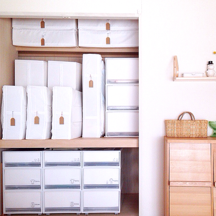 押入れのスペースを無駄なく活用できて、見た目もスッキリ仕上がるところが嬉しいポイントです。タグを付けて中身を分かりやすくした工夫もお見事。
