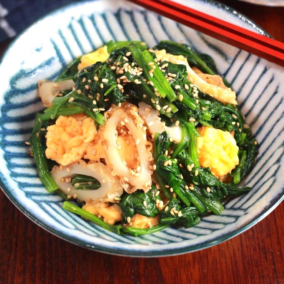 今回は「ほうれん草とちくわと炒り卵の3色ナムル」をご紹介します。