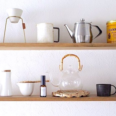 ウォールシェルフには_chunk99_さんがこだわった道具たちが並んでいます。コーヒーセットや紅茶セットなど、普段のリラックスタイムには欠かせないアイテムを並べることでおしゃれなインテリアに。