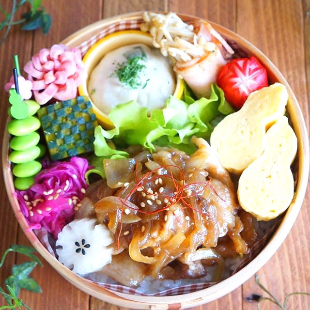 とっても簡単な一工夫ですが、生姜焼き弁当をパッと華やかに見せてくれる優秀アレンジです。