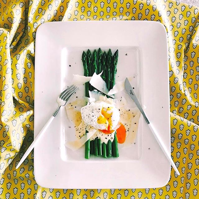 火を通したグリーンアスパラにポーチドエッグとたっぷりのチーズを乗せた、とっても簡単な人気料理です。