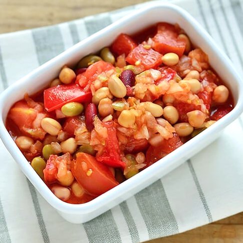 トマトや玉ねぎ、ミックスビーンズなどの野菜がたっぷり入っており、栄養バランスも良いおかずです。カオマンガイ献立の栄養バランスを整えたい時にもおすすめですよ。