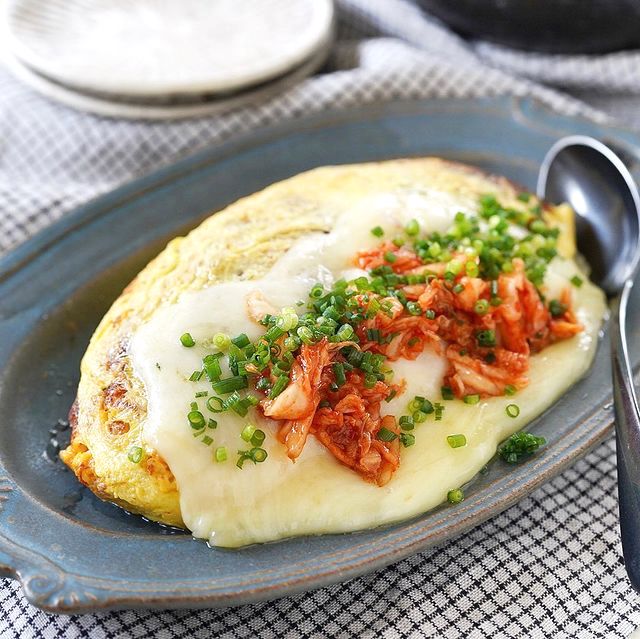 キムチと長いもが入ったこちらのふわとろオムレツは、お酒のおつまみにぴったりの人気料理です。