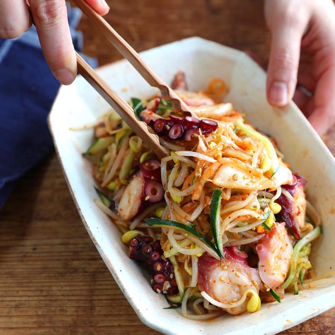 きゅうりにもやし、キムチにタコも合わせた具だくさんの副菜で、サムギョプサルの献立にもおすすめ。