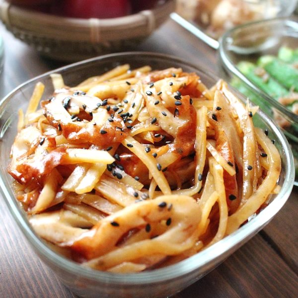 レシピも簡単でじゃがいもの大量消費ができます。ソース味のきんぴらはお弁当のおかずにもおすすめ。