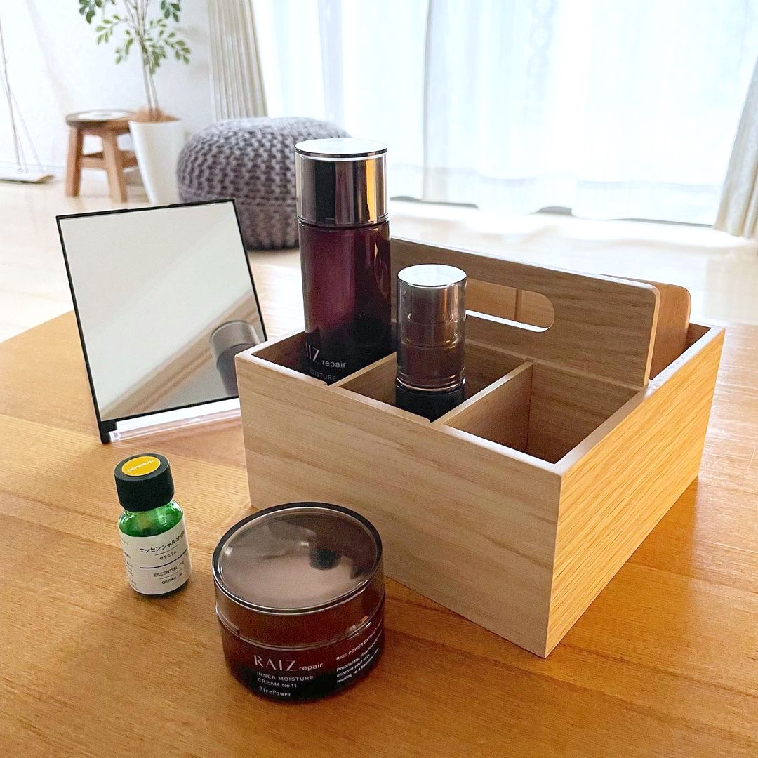 リモコンやペン立てにもおすすめですが、私はスキンケア化粧品を入れています。