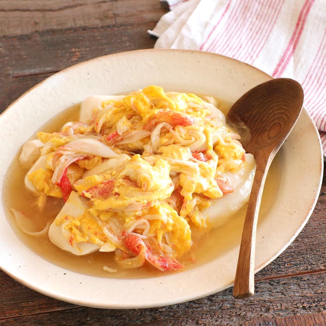 電子レンジで加熱した豆腐の上にフライパンで焼いたふわふわ卵を乗せ、上にあんかけをかけるだけで完成します。