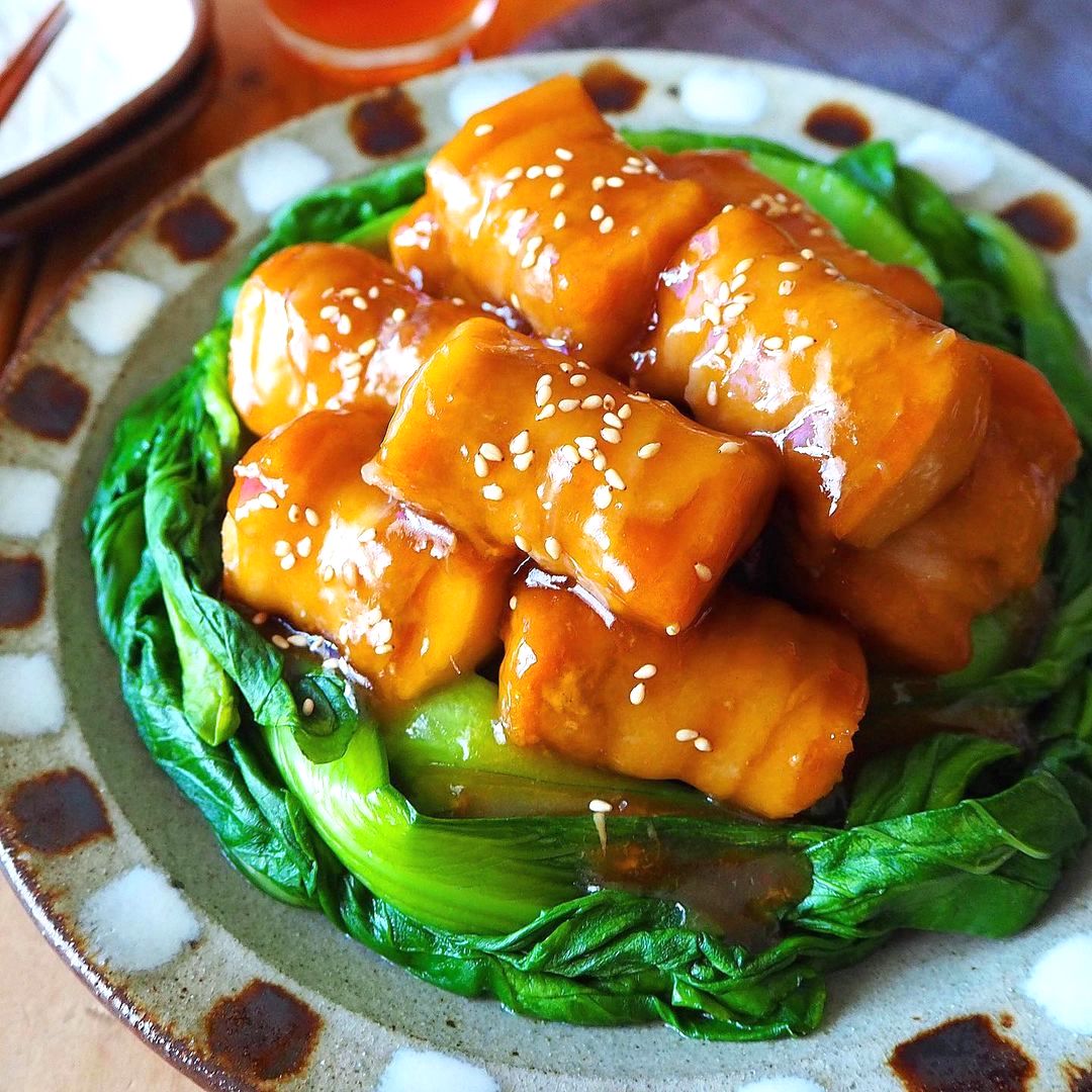 厚揚げを豚バラの薄切り肉で巻いて、甘辛く味付けしたおかずです。この料理はレンジで簡単に作れるので、年越しそばと合わせて献立にしやすいですよ。
