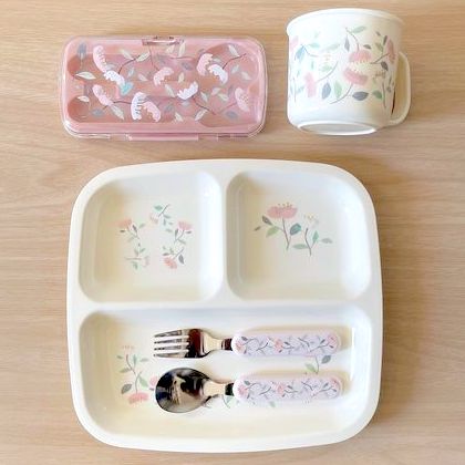 キッズ用のアイテムが充実している3COINS。仕切り付きプレートとコップのセット、カトラリーとケースのセットなどに注目です。