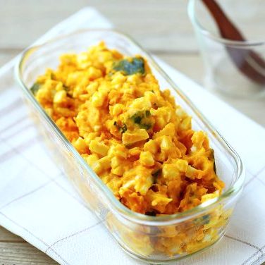 かぼちゃの優しい甘みが魅力のサラダです。かぼちゃだけでも美味しいですが、こちらのレシピではゆで卵も加えてボリュームアップ!バターチキンカレーの献立にも合う、コクのある味わいが魅力的です。