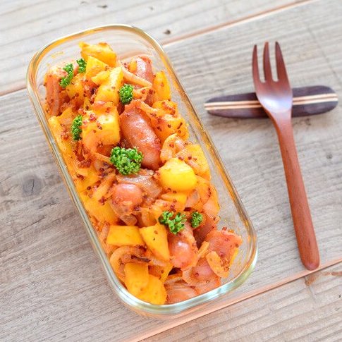 フレンチトーストの献立には、ウインナーを使ったおかずが人気です。こちらはウインナーとじゃがいも、玉ねぎで作るマスタードケチャップ炒め。