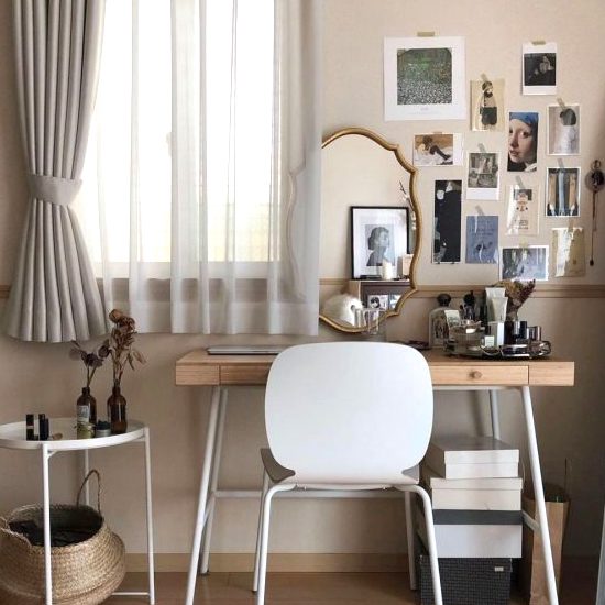 こんなインテリアを見ながらならメイクもセンス良く仕上がりそう。マスキングテープでラフに貼られているのが心憎い実例です。