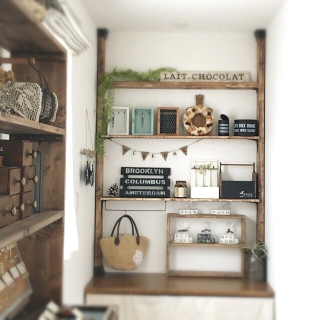 白く塗ったディアウォールの板に、Ⅼ字型の金具で塗装しない棚を付けている例がこちら。