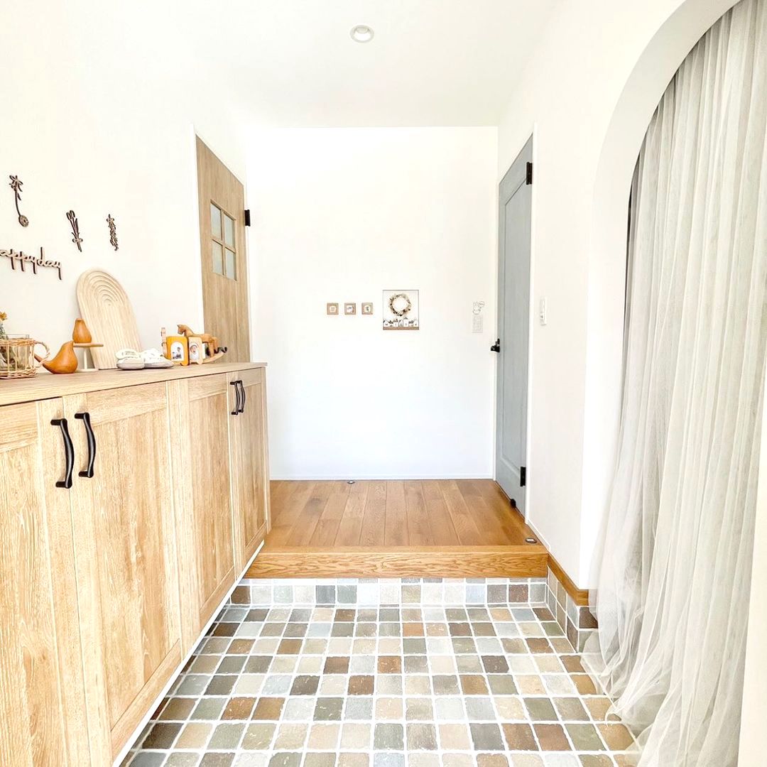 雑貨は必要最低限のものだけ置くようにしてください。玄関のタイルはモザイク風にしているため、とても素敵な空間に仕上がっています。